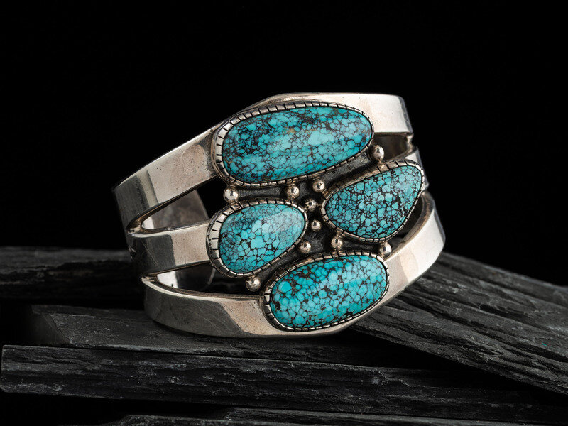 stamped split shank set with four high grade stones; etched F. BEGAY