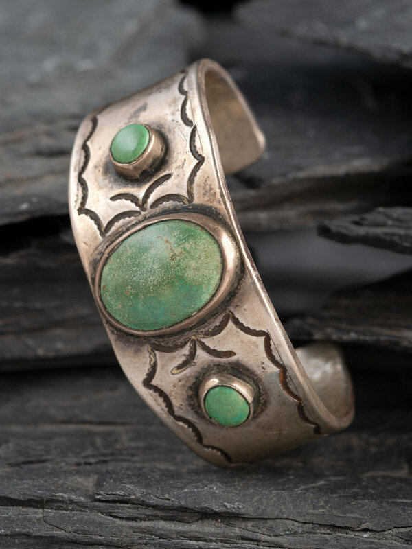 heavily stamped along the edges, featuring three turquoise stones; not marked