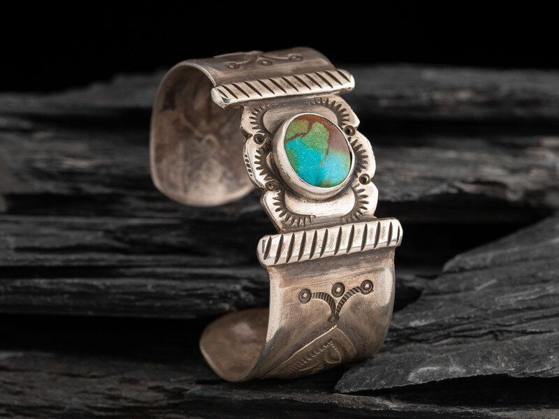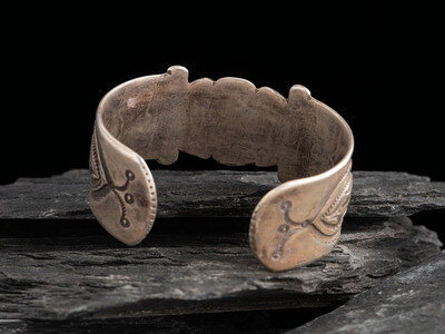 cuff width 1-1/4 inches, interior circumference 5-7/8 inches + gap length 7/8 inch, weight 43.6 dwt.