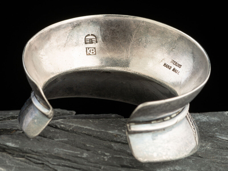 deeply fluted architectural shape with floral design elements; marked STERLING HAND MADE KB and the White Hogan shop mark
