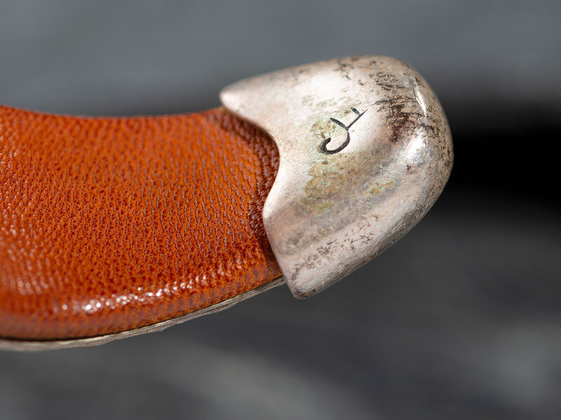 a silver cuff lined on the interior with leather and set with spiny oyster and turquoise; marked CF on end caps for Charlie Favour
