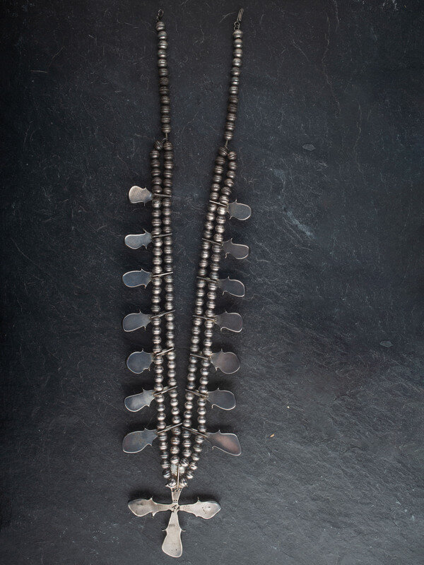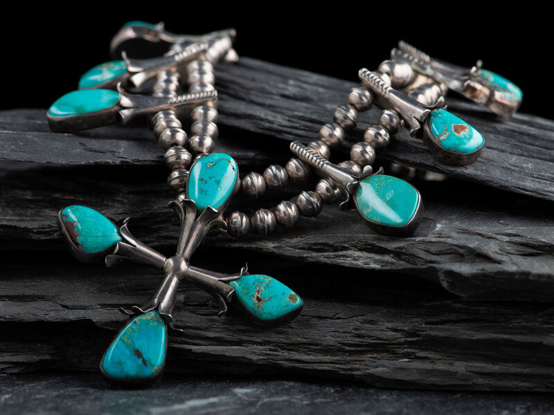 Navajo Silver and Turquoise Squash Blossom Necklacce, with Cross Naja