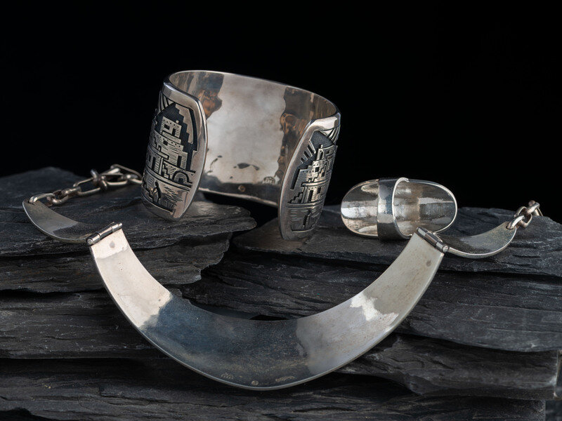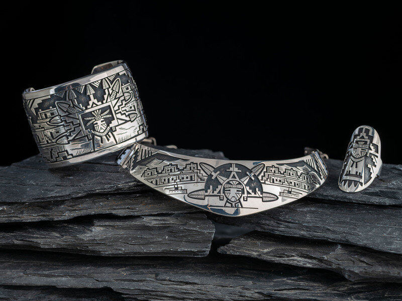 Sterling Silver Overlay Shalako Choker Necklace, Cuff Bracelet, and Ring Set
