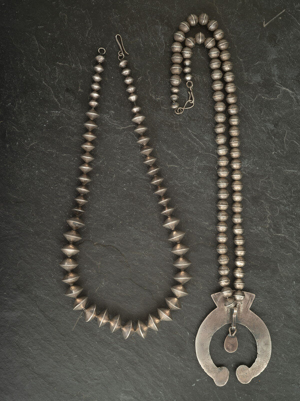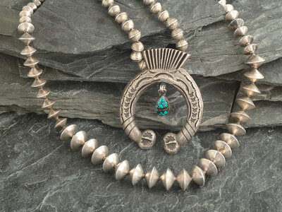 a single strand necklace featuring a sancast naja set with a single turquoise stone; not marked