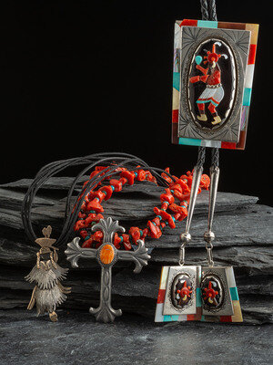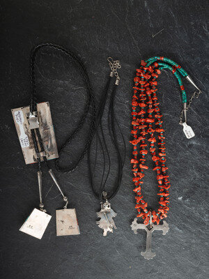 a double-strand coral and turquoise necklace with sandcast silver cross set with spiny oyster; marked AJB STERLING