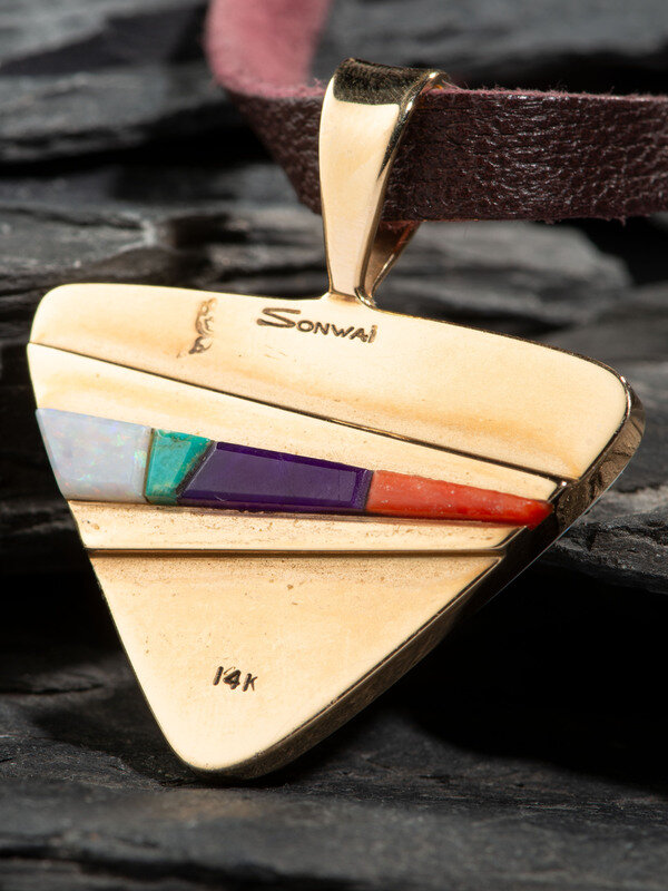 Reversible 14K Gold Pendant, set with Coral, Opal, Turquoise, and Sugilite Mosaic Inlay