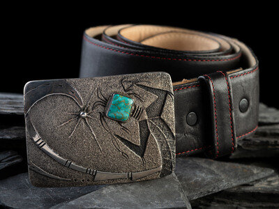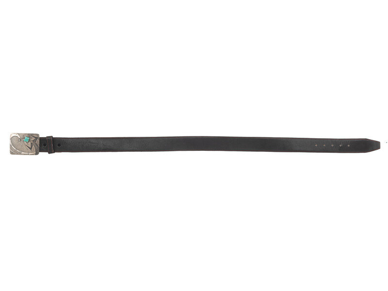 includes a black leather belt with removable snaps; signed on back by artist