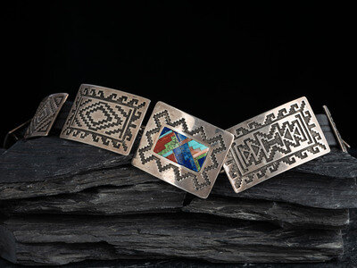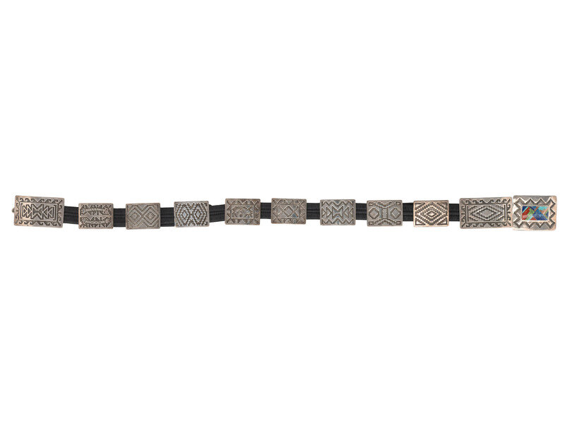 features a three-piece buckle inlaid with lapis, coral, turquoise, and serpentine; eight rectangular conchas, each with a differing design assembled on an adjustable black leather belt; signed JACKSON