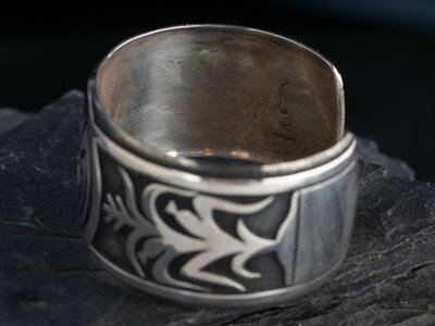 a cuff featuring a central Man-in-the-Maize design along with a cornstalk and bear paw on the shanks; marked RG STERLING for Bradley Gashwazra (b.1936), further marked with the Kokopelli shop mark of Kopoavi International