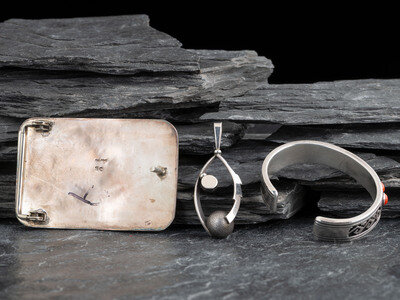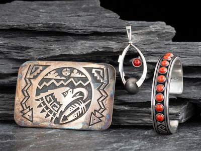 Navajo Silver and Coral Cuff Bracelet and Pendant, PLUS