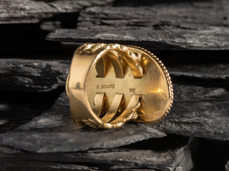 stamped split shank ring with stamped serrated and twisted wire bezel; signed P. SHORTY and marked 18K