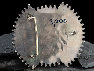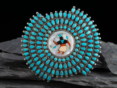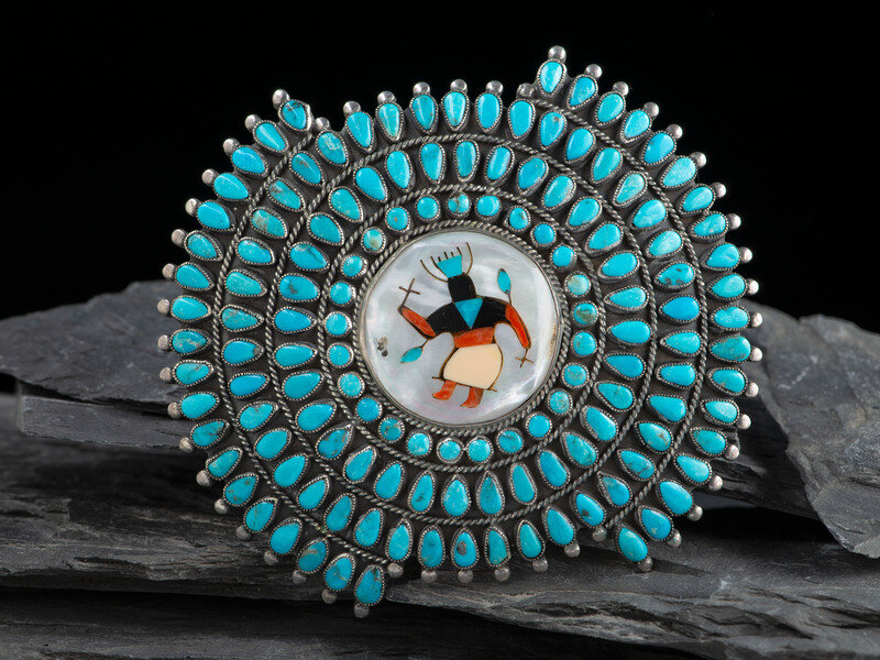 featuring a central mosaic inlaid Gan Dancer surrounded by petit point turquoise clusters; not marked