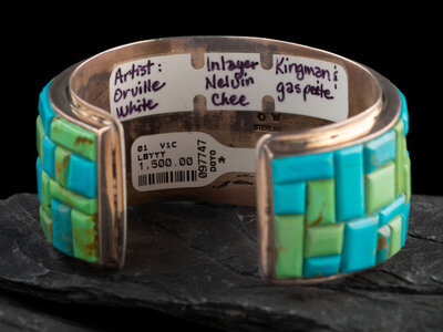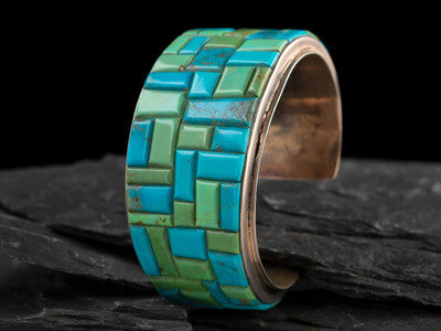 Sterling Silver Cuff Bracelet, with Turquoise and Gaspite Cobblestone Inlay