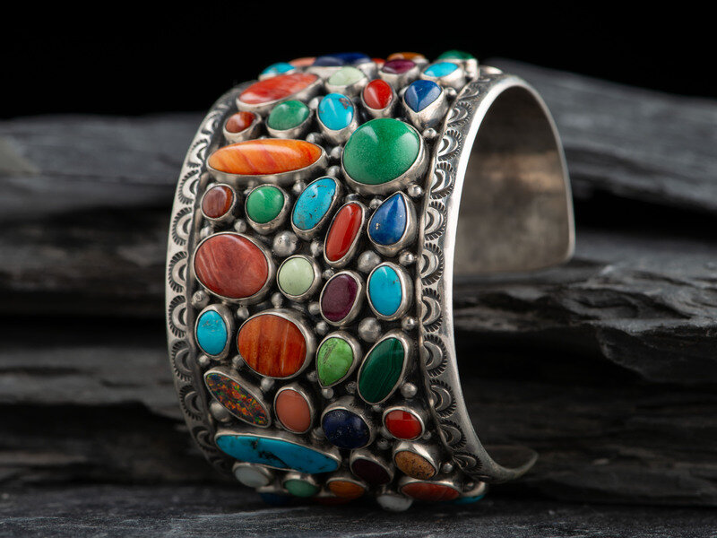 set with a variety of stones in differing shapes and sizes, including turquoise, coral, spiny oyster, opal, lapis, malachite, and gaspite; marked LJ STERLING