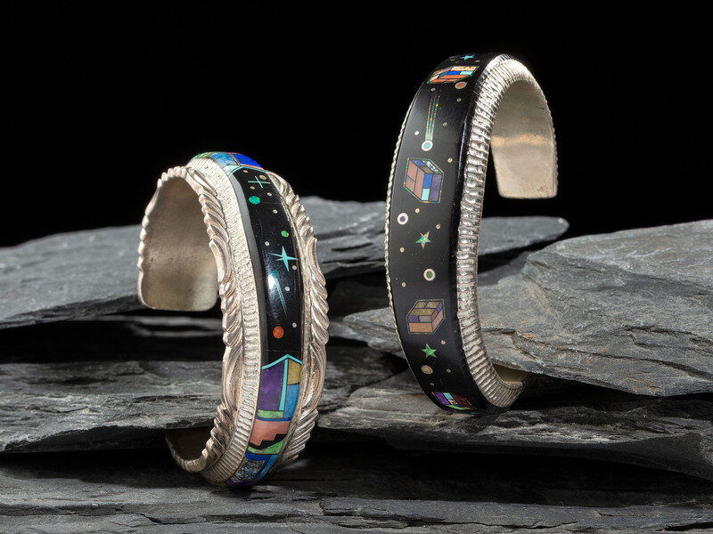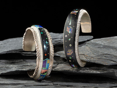 Pair of Sterling Silver and Mosaic Inlay Cuff Bracelets, with Cosmic Scenes