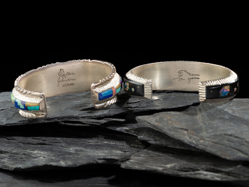 one with a central cosmic scene complete with shooting star, and a mosaic inlay design on the sides; signed ALVIN YELLOWHORSE and marked with artist's horse hallmark and STERLING