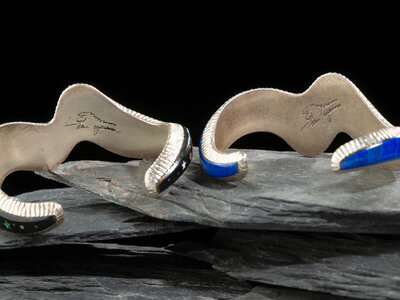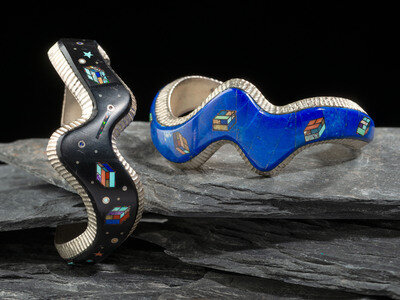 Pair of Sterling Silver and Mosaic Inlay Wave Cuff Bracelets, with Rubik's Cubes