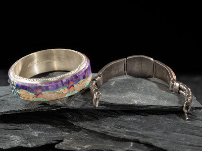 Pair of Sterling Silver and Mosaic Inlay Bangle and Link Bracelets
