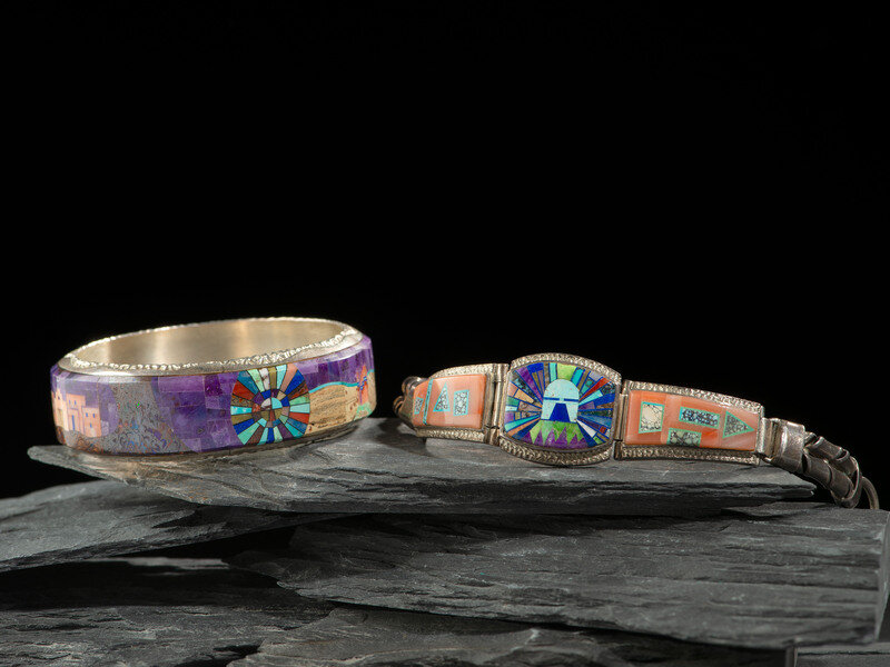 a bangle, set with a pueblo and Monument Valley scenes; signed ALVIN YELLOWHORSE