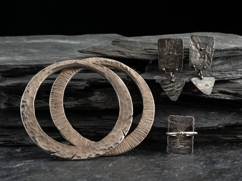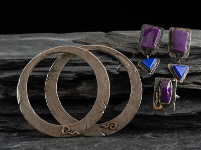 Sterling Silver Bangle Bracelets, Ring, and Earrings with 14K Gold Accents