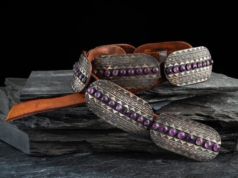 eight heavily stamped oval conchas and matching buckle; signed SETH BROWN TAOS marked STERLING