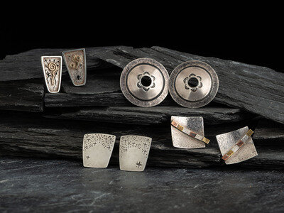 a squared mixed metal pair of silver, copper, and brass; marked CTG by Connie Tsosie-Gaussoin (Diné-Picuris, b. 1948)