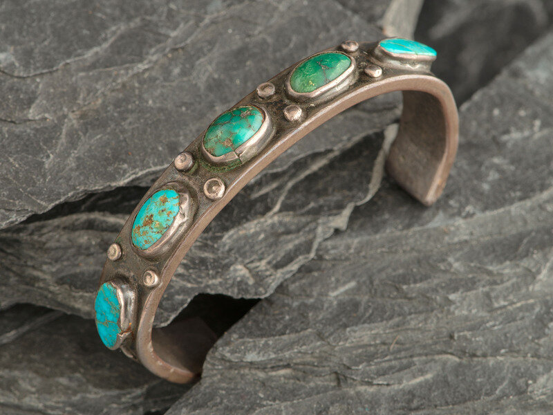 heavily stamped shank and set with five turquoise stones; not marked