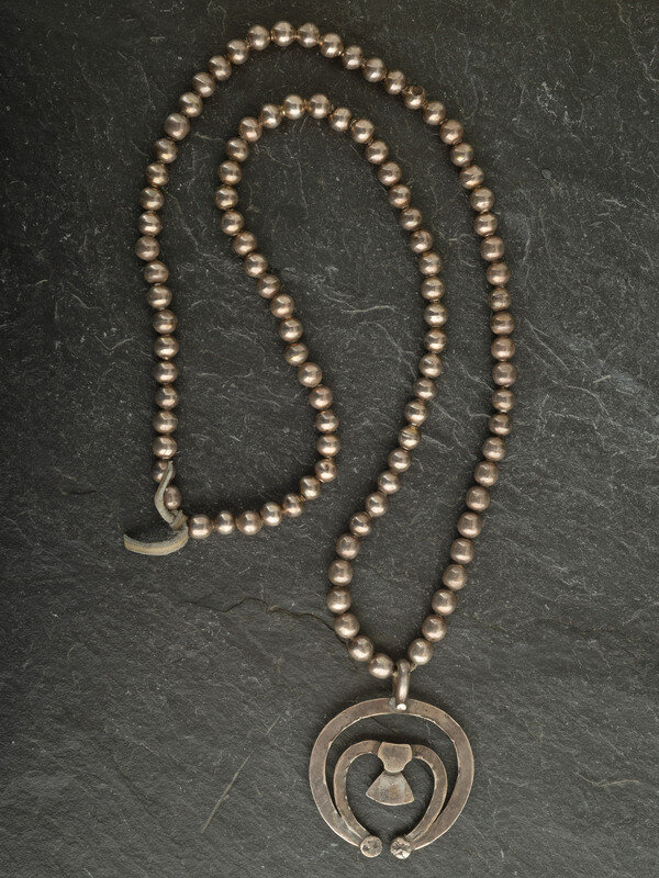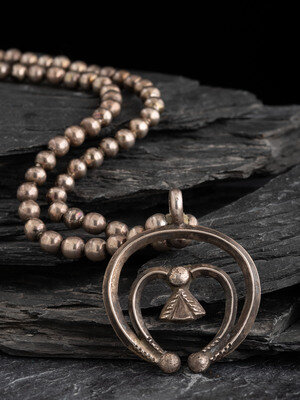 single-strand of handmade silver beads, featuring a double crescent naja; not marked
