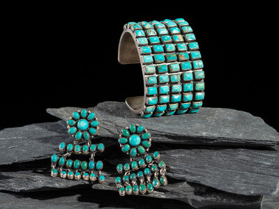 Sterling Silver and Turquoise Cluster Cuff Bracelet and Clip Earrings