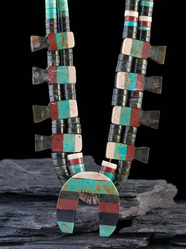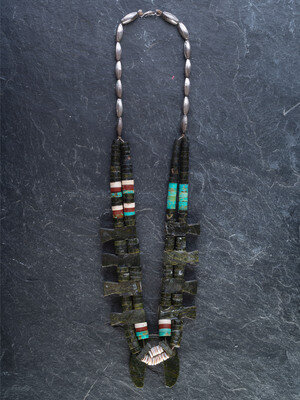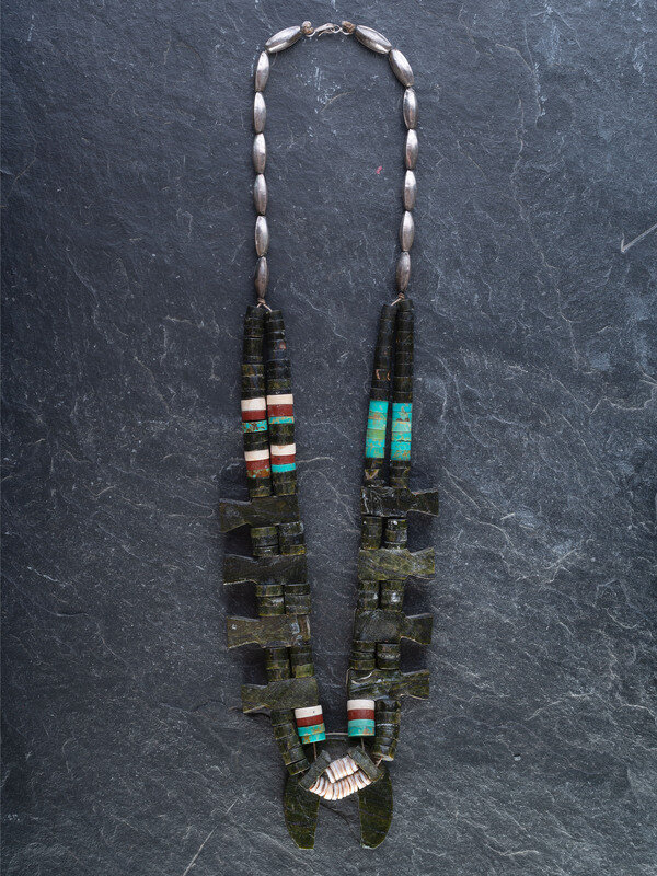 double-strand strung with serpentine, turquoise, pipestone, and jet; not marked