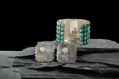 Sterling Silver and Turquoise Cluster Cuff Bracelet and Post Earrings
