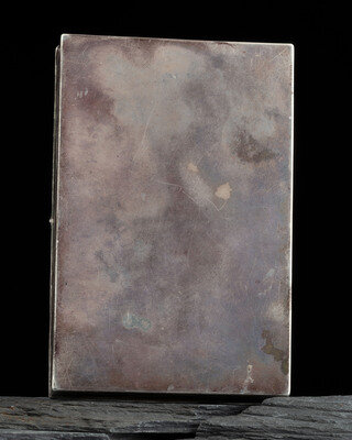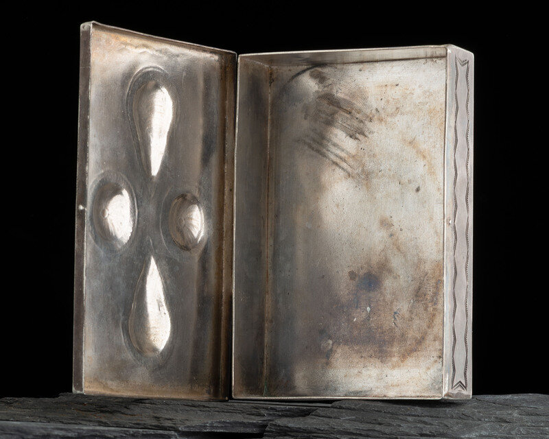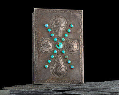 stamped along the sides and edges; the lid further decorated with repoussé and turquoise stones; not marked