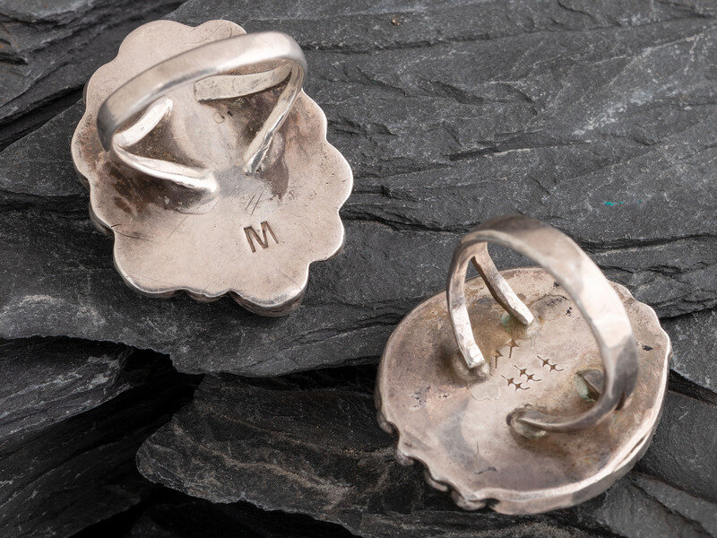 a split shank example set with a cluster of seven turquoise nuggets; marked M