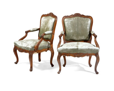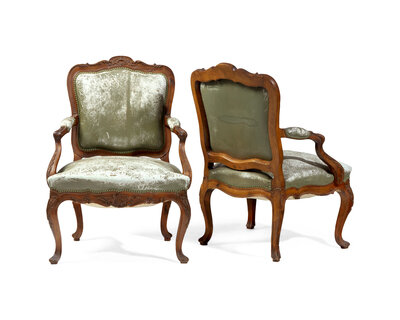 A Pair of Italian Rococo Carved Walnut Armchairs