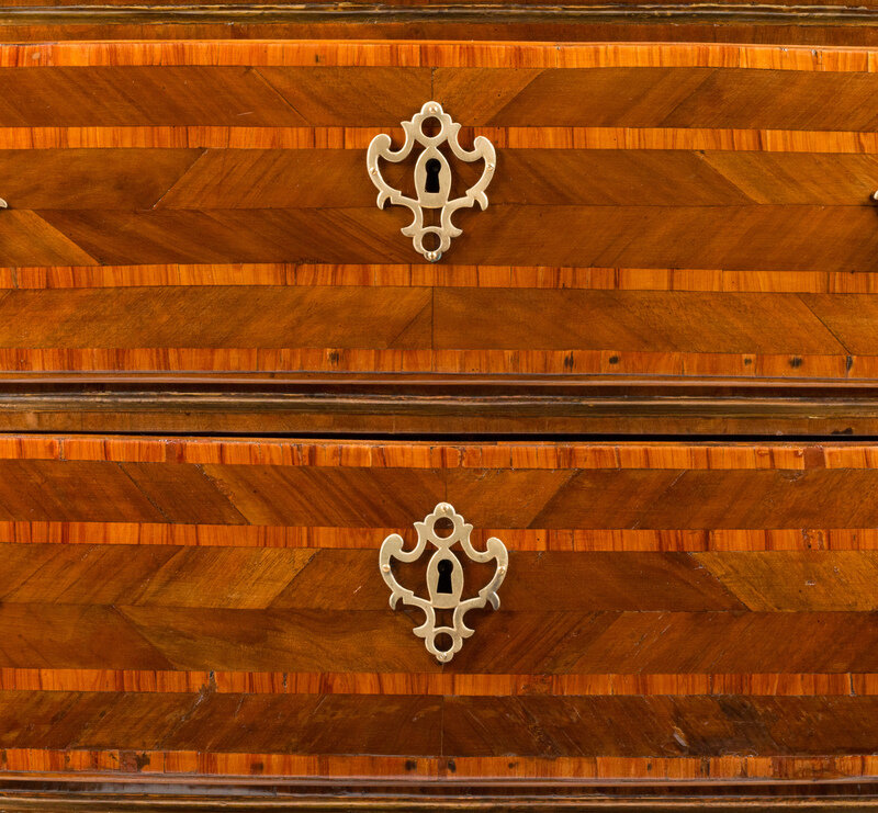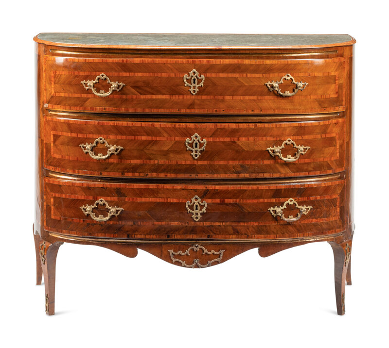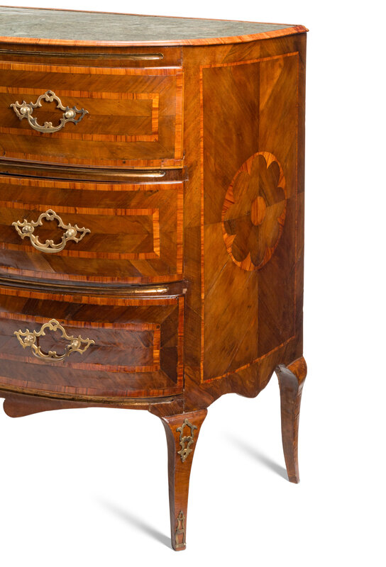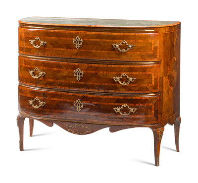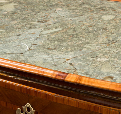 A Continental Walnut, Marquetry and Scagliola-Inset Commode