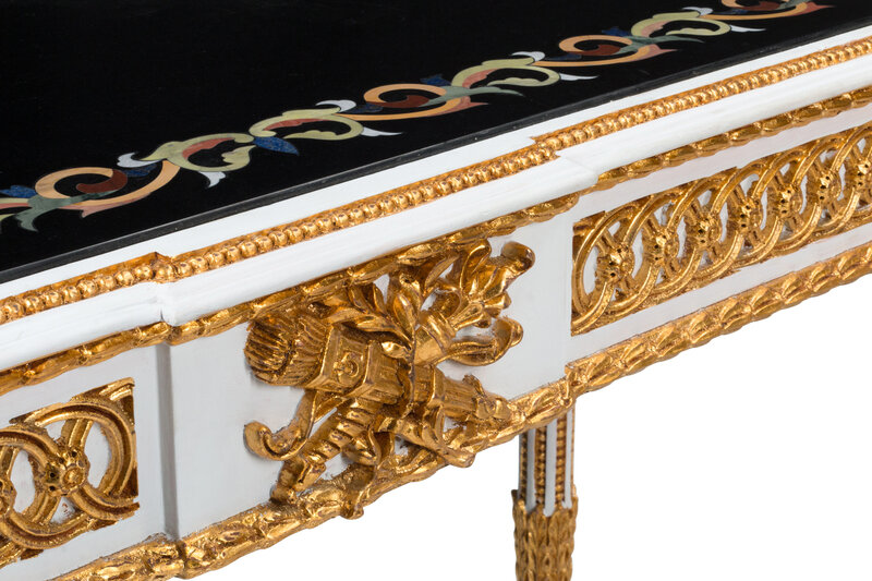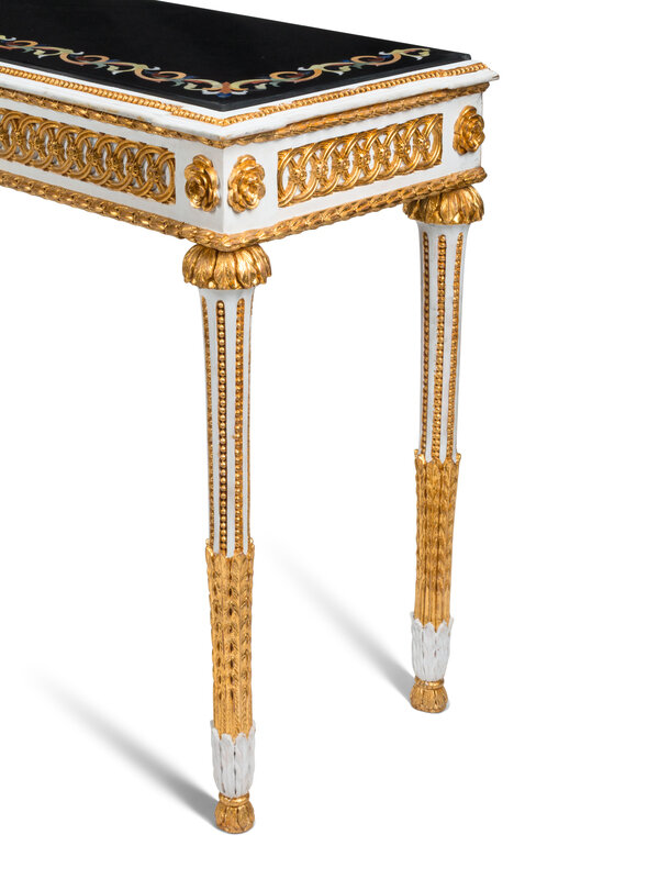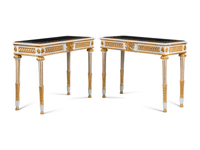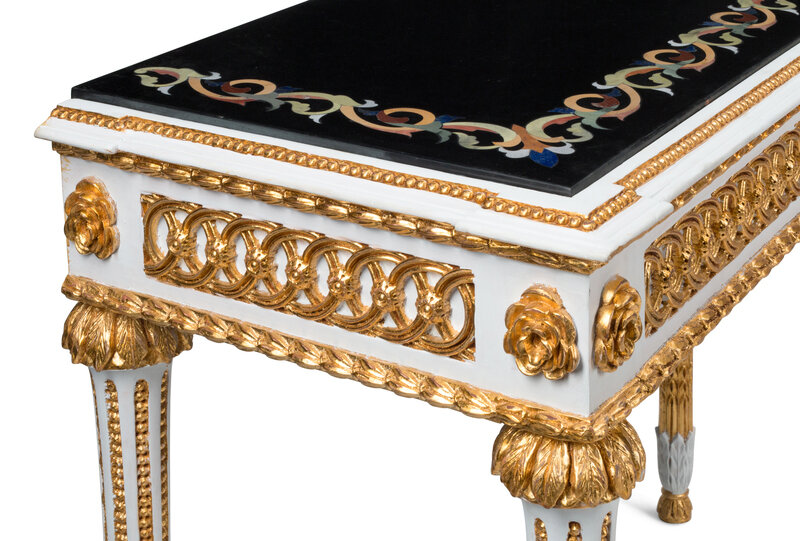 A Pair of Italian Neoclassical Style Painted and Parcel Gilt Specimen Marble-Top Console Tables