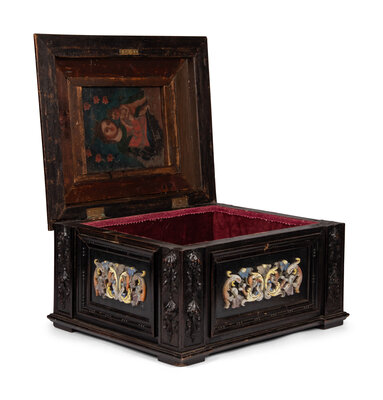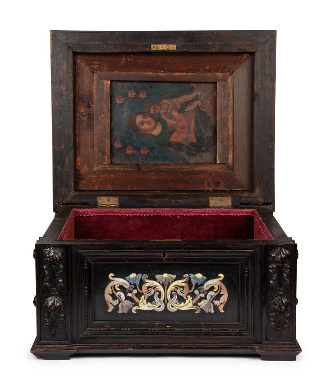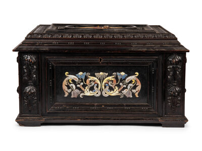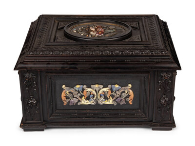 A Continental Baroque Style Hardstone Mounted Ebonized Table Casket