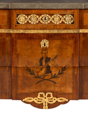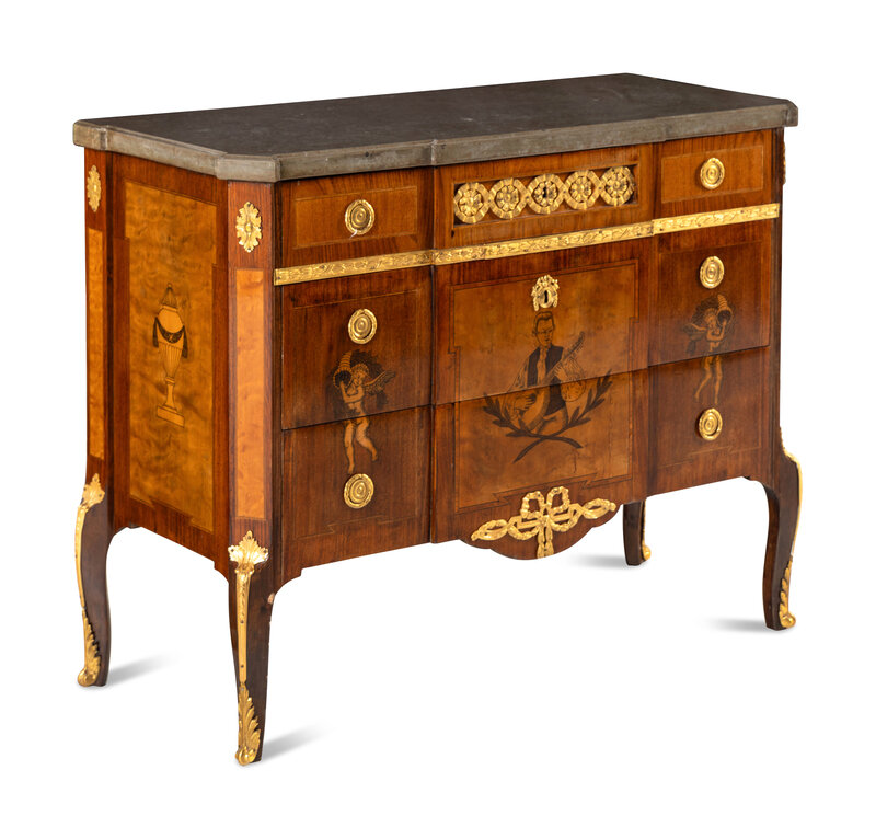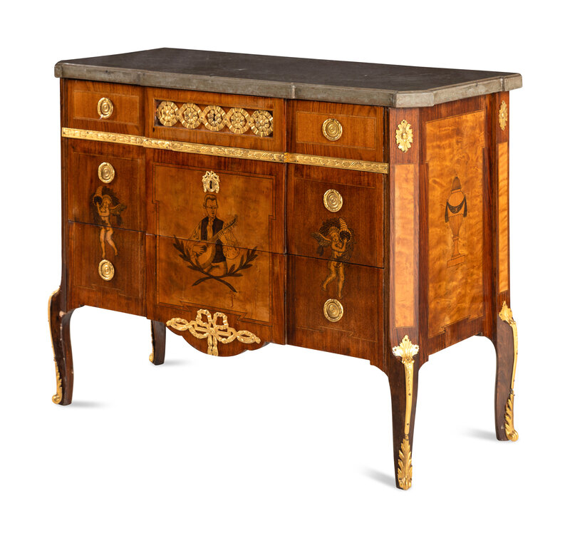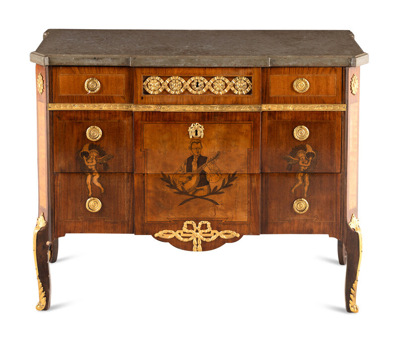 A Baltic Gilt Bronze Mounted Marquetry Marble-Top Commode
