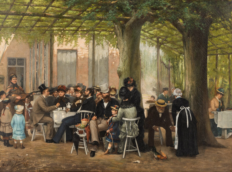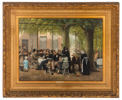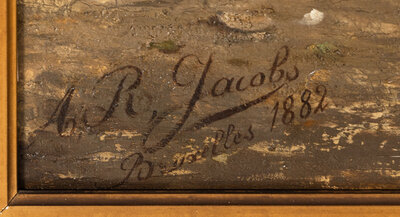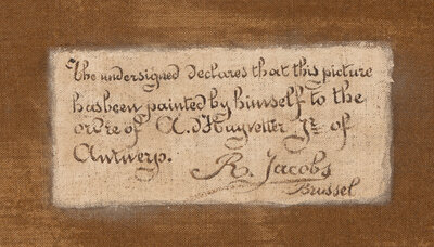 signed A.R. Jacobs / Bruxelles / 1882 (lower left) and inscribed on verso 'The undersigned declares that this picture has been painted by himself to the ordre of A. D'Huyvetter Jr. of Antwerp. / R. Jacobs / Brussel'