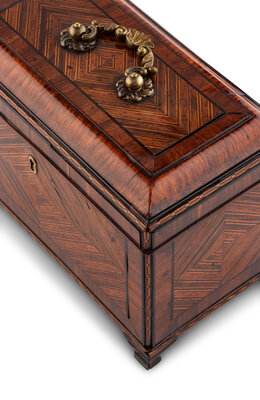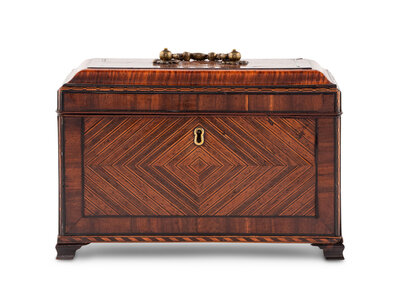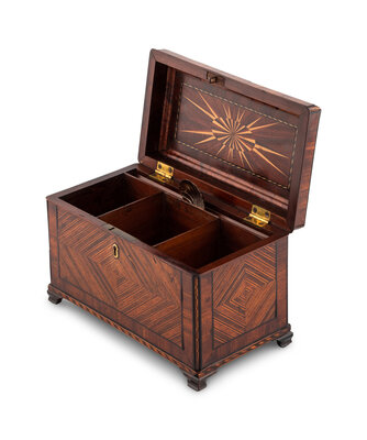 A George III Tulipwood, Ebony and Fruitwood Parquetry Tea Caddy