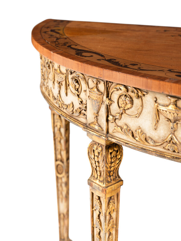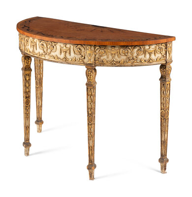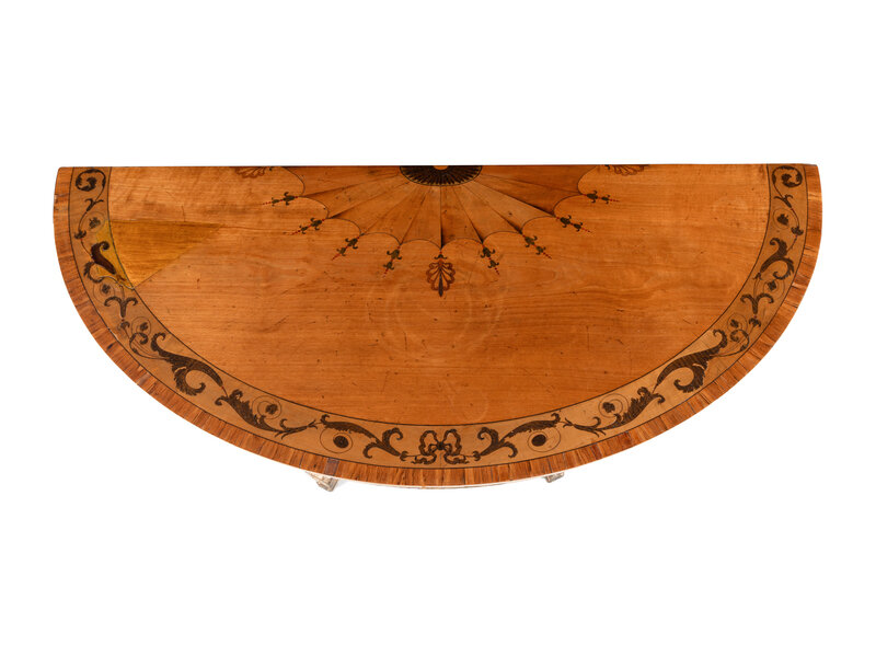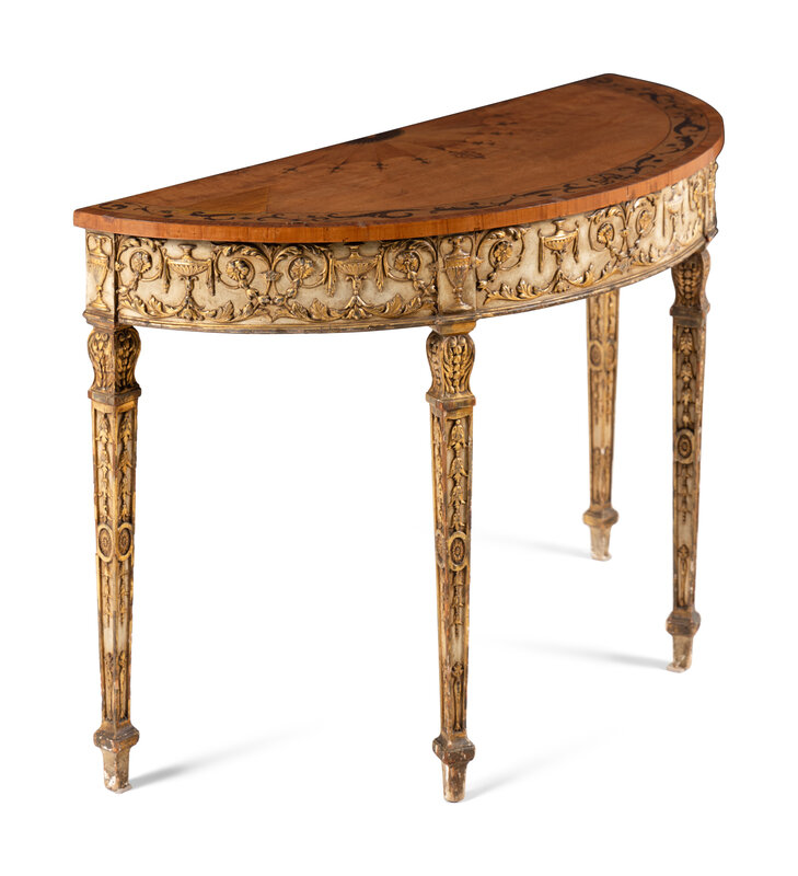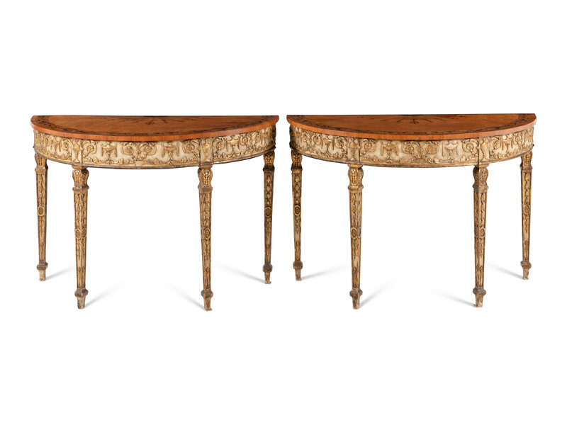 A Pair of George III Style Satinwood, Marquetry, Painted, and Parcel Gilt Demilune Console Tables