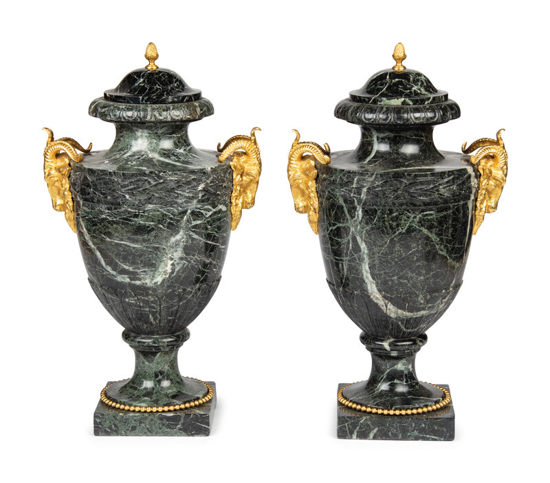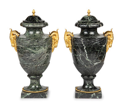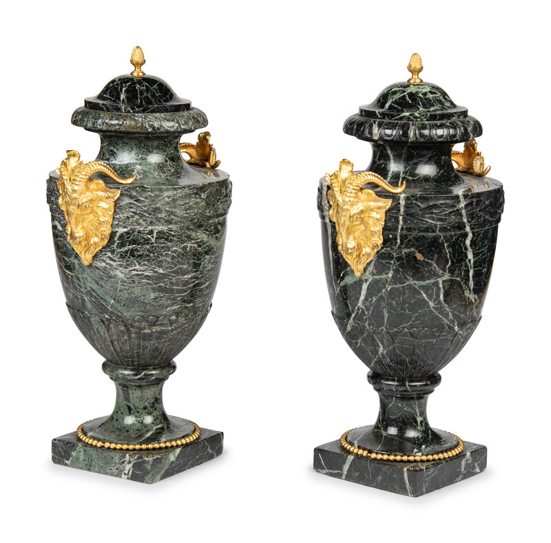 A Pair of Louis XVI Style Gilt Bronze Mounted Marble Urns