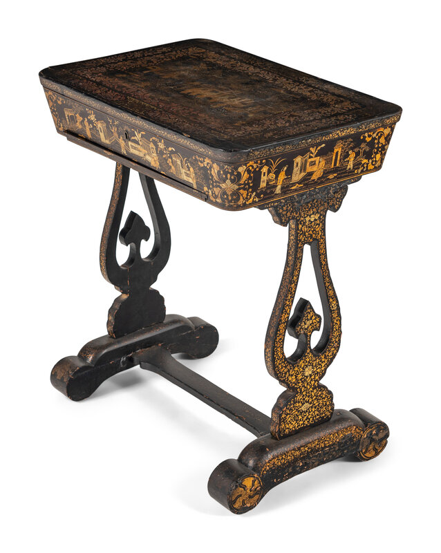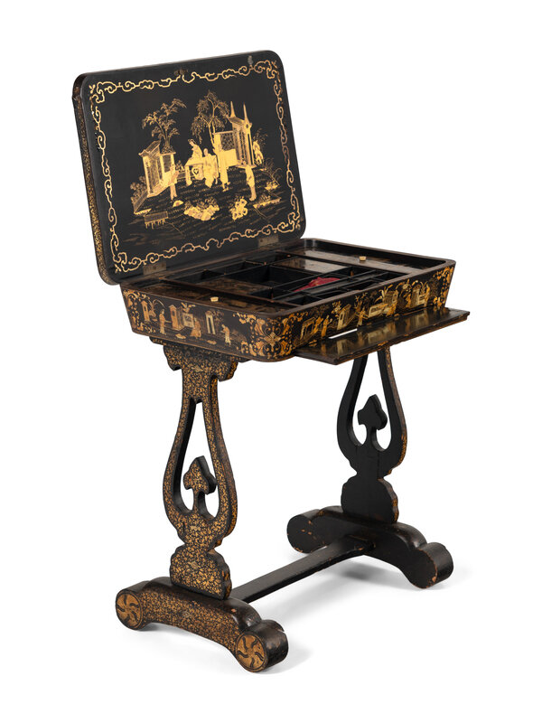 A Chinese Export Black Lacquer and Parcel Gilt Needlework Table