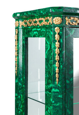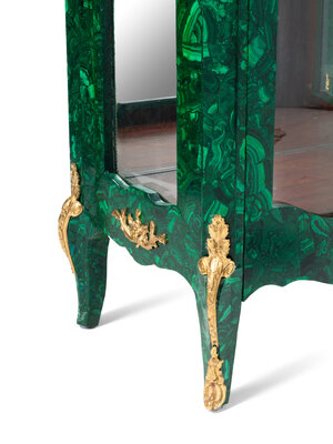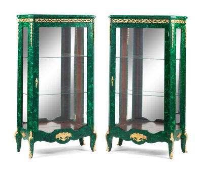 A Pair of Louis XVI Style Gilt Bronze Mounted Malachite Vitrine Cabinets