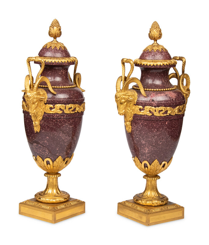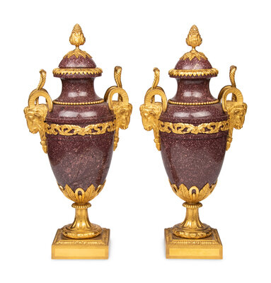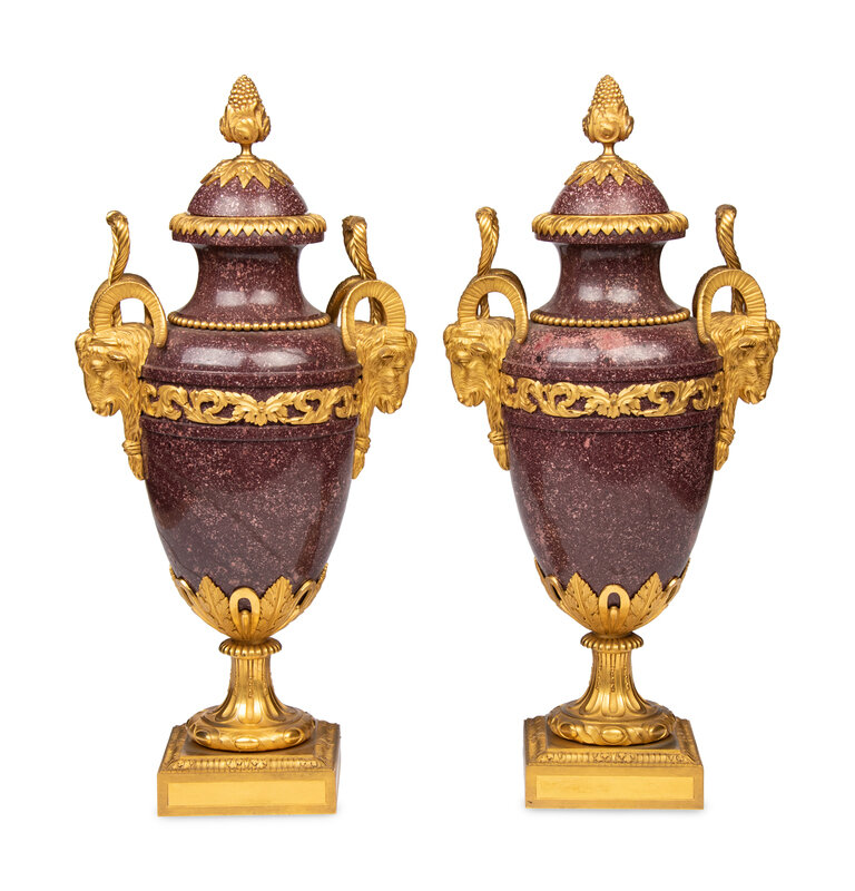 A Pair of Louis XVI Style Gilt Bronze Mounted Porphyry Urns