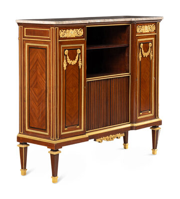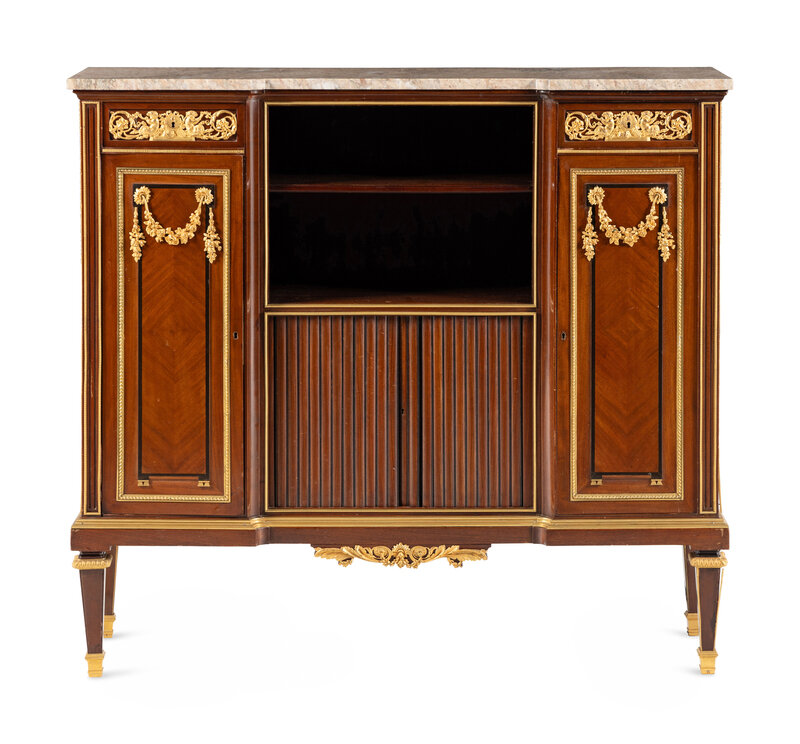 A Louis XVI Style Gilt Bronze Mounted Mahogany Marble-Top Cabinet