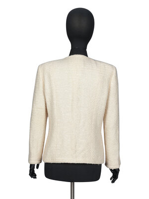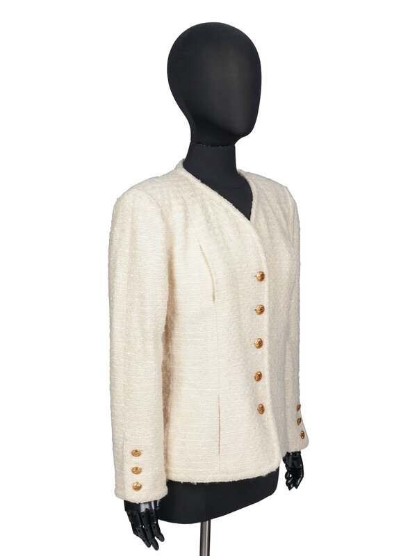 Cardigan jacket in cream bouclé tweed. Collarless round neckline, dipping into a slight V at front. Padding at shoulders. Wrist-length three-piece sleeves with working buttoned cuffs. Self-bias binding at neckline, front edges, and sleeve cuffs. Four vertical in-seam pockets at front. Button closures at front with gold-tone metal CC insignia buttons. Fully lined in tonal silk habotai.