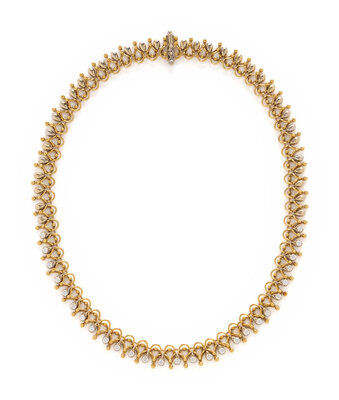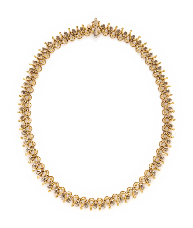 Front section set with round diamonds weighing approximately 2.00 carats total. 18 karat yellow and white gold. 17 inches long.