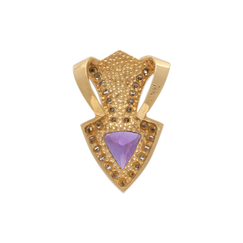 Triangular tanzanite weighing approximately 7.00 carats by formula, round diamonds weighing approximately 1.50 carats total, and inlaid black opal. 14 karat yellow gold. 1 3/8 inches long.