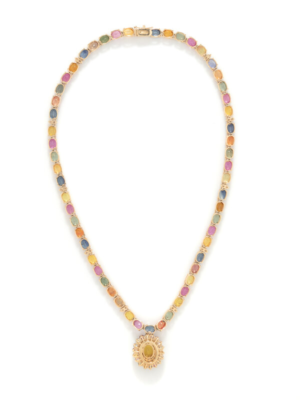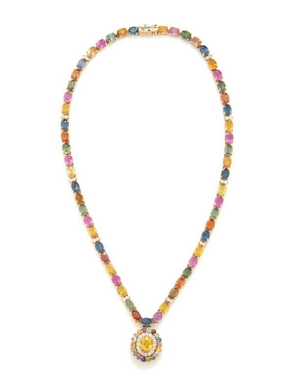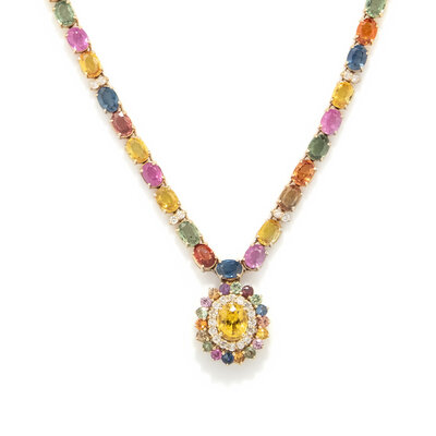 MULTICOLORED SAPPHIRE, DIAMOND, AND YELLOW GOLD PENDANT NECKLACE
